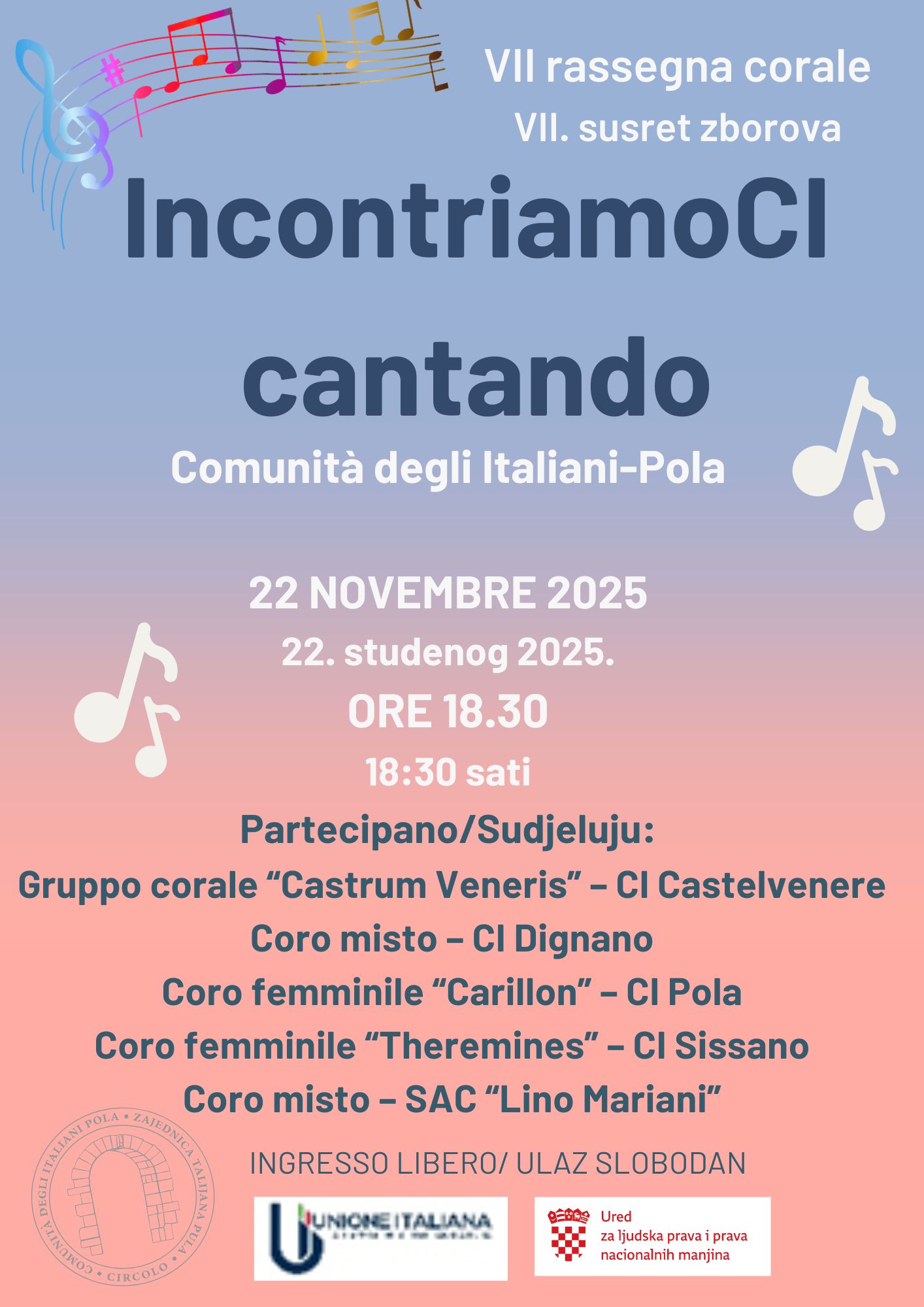 La Comunità degli Italiani di Pola è lieta di invitarvi alla settima edizione della rassegna corale “Incontriamoci Cantando”,che si terrà venerdì 22 novembre alle ore 18:30
